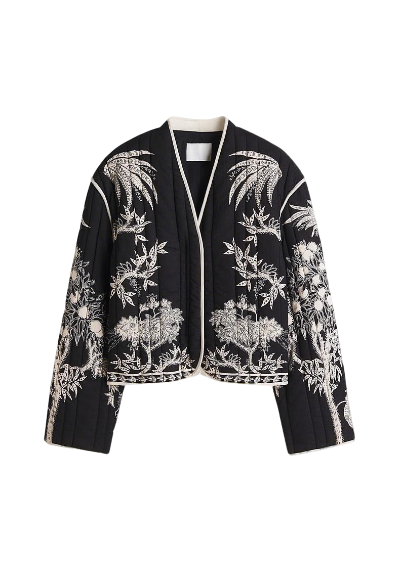 冬季新品女装欧美风V领长袖印花绗缝薄棉短款夹克外套 1316449